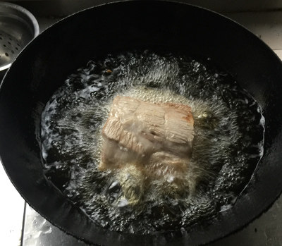 2. 五花肉切成方块,刮洗干净表面油污,用清水浸泡出血水