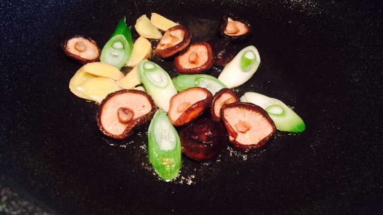 2. 锅中油加热7成热放葱姜,出香味放香菇礼物煸出香味。