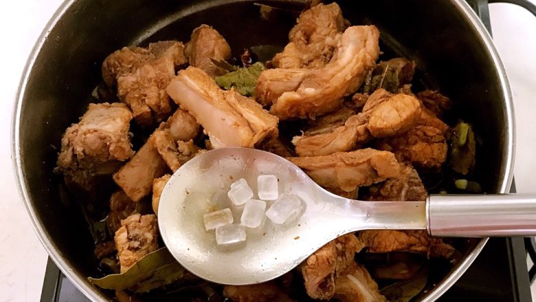 14. 加入开水,水量没过排骨,盖上锅盖,发货烧开后小火烧25分钟
