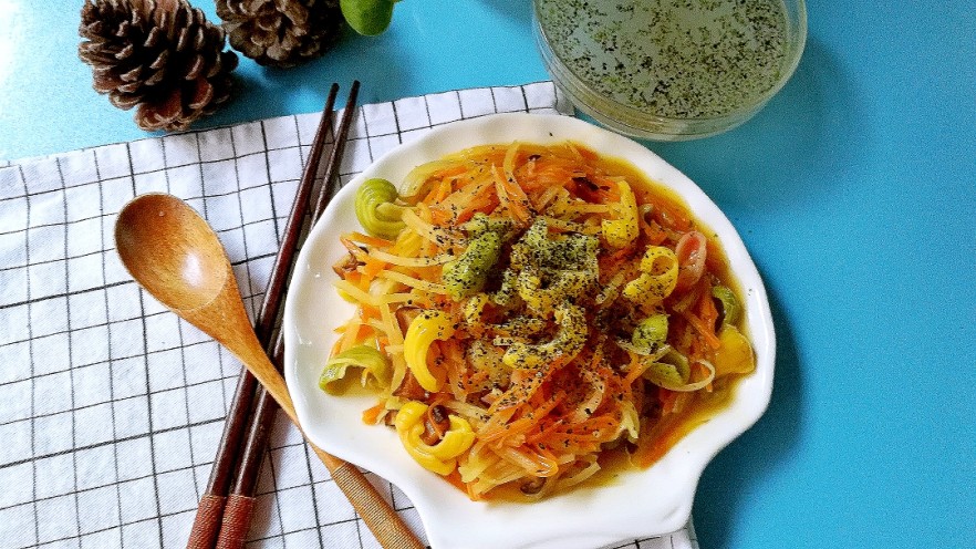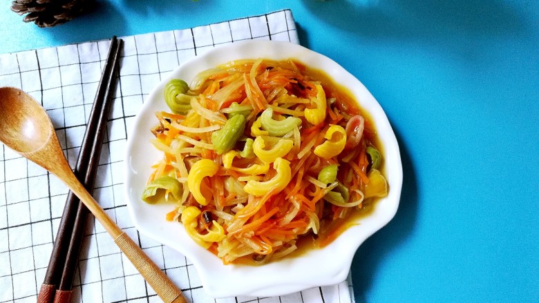 11. 倒入多味圈圈面搅拌均匀,炒至熟透即可