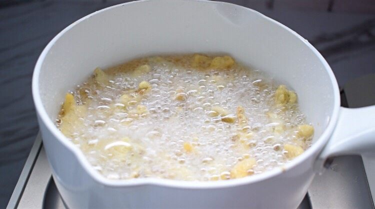 13. 等锅中油温再次升高时放入复炸至金黄色即可享受