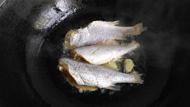 5. 起锅放油,把姜放入煎一煎,撒入少许盐,这样煎鱼的时候,鱼就不容易粘锅了