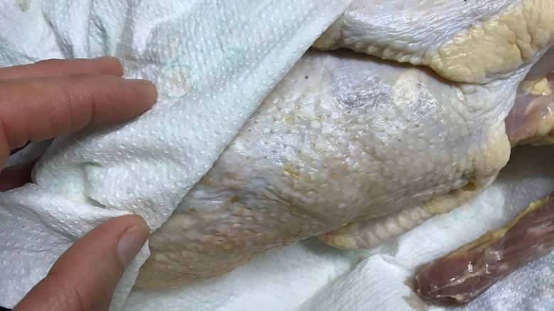4. 第二天把鸡全身都用厨房纸吸干水份。