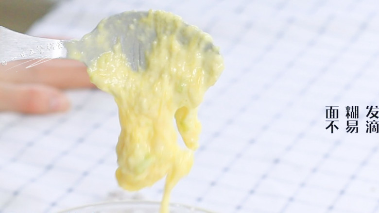 4. 再加入70克面粉,搅拌至发黏不易滴落的面糊。