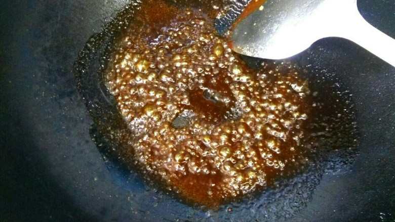 8. 把炒锅洗净,烧干,不用放油,直接放入两勺甜面酱,两勺生抽,两勺料酒,半勺糖