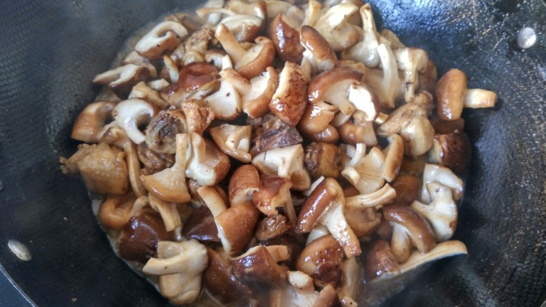 14. 香菇变软出汁,盖上锅盖,中火焖煮。