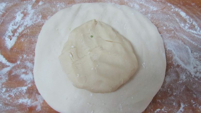 6. 醒好的水油面团加面薄,稍微擀成圆片,把油酥面团放到中间慢慢收口包好
