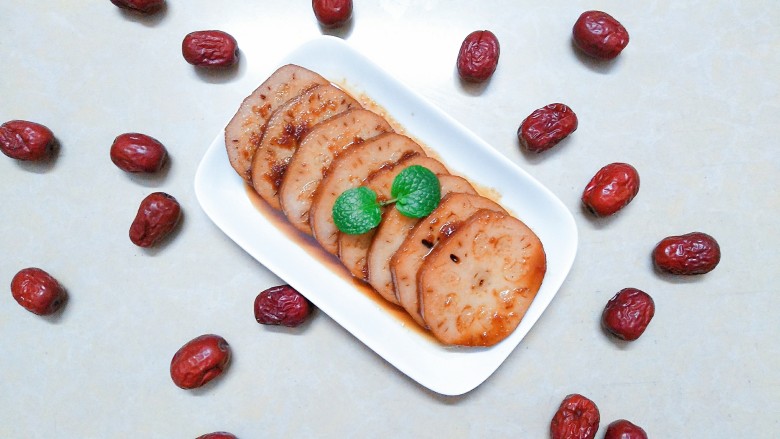- 要想吃这道甜点,需要的是耐心,一定要在煮熟后让其浸泡一夜,这样莲藕里面才会彻底入味,泡一夜之后,要再开大火把汤汁收浓,再把莲藕拿出来切片!