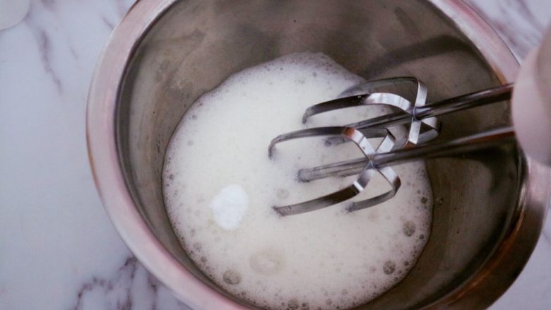 8. 打蛋器打开,打到有鱼眼泡第一次加糖