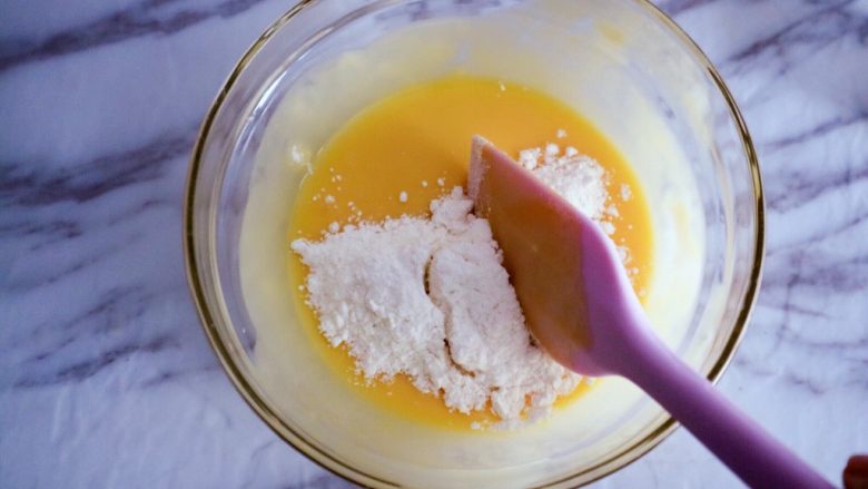 11. 步骤方法和做蛋糕一样,就是配料有些改变,取三分之一蛋白加入面糊中翻拌均匀