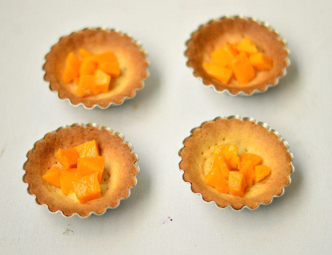 13. 挤上紫薯泥,再摆上芒果肉丁即可