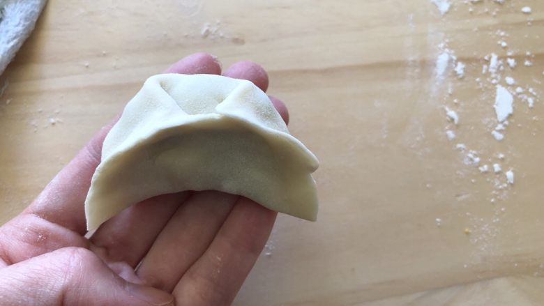 11. 对折饺子皮,中间处捏合,然后如图所示,两边从中间推进去,捏紧,然后凸出来那一小块再从凸出处往里按压捏紧