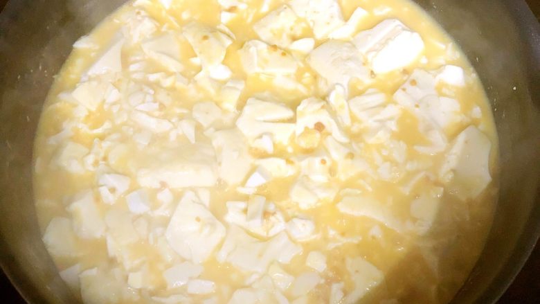 8. 把豆腐捣碎,然后加入1勺白糖,翻拌均匀