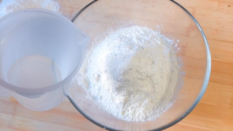 9. 进行另外的关键步骤,那就是和面!这个和面可是跟平时做饺子面条不太一样哦!因为我们要用开水和冷水交替和面,这样和出来的面,煎出来,酥脆可口,又外酥内软,最关键,放凉了也不会硬。 注意:取300g的面粉,在一个大碗里。用150毫升的开水,缓慢倒进面盆里。边倒边搅拌,用筷子搅拌哦!用手的话,那就是焯猪手了。哈哈哈!