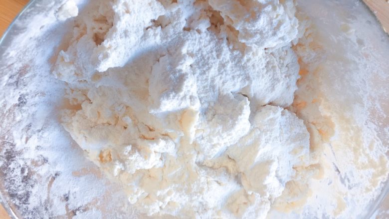 10. 面团就成了这样的,有点透明的大疙瘩状态了。有点烫面的感觉。