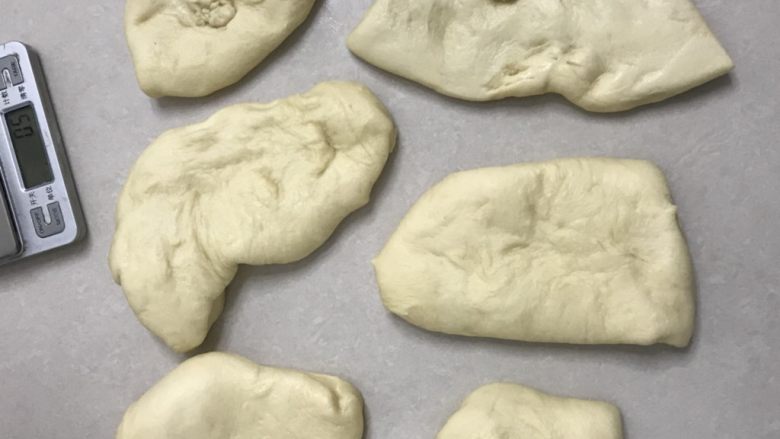 18. 取一面团收口朝下,先用手拍打面团排气,再用擀面杖从中间向俩头擀开,边缘上的气泡用手拍掉。