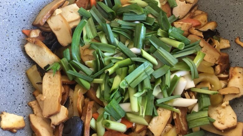 14. 倒入黑木耳、胡萝卜、榨菜丝翻炒