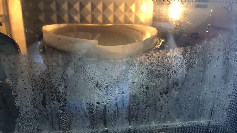 16. 预热好的烤箱里,最下层放一个烤盘,里面注满水,烤盘上一层放置烤网,把模具放在烤网上,进行烘烤,180度30分钟转150度再烤30分钟,时间温度不固定,根据自身烤箱温度调节。看上色情况