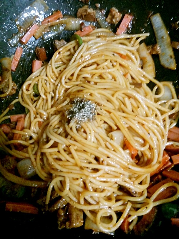 13. 面下锅后,翻炒几下,就可以,面不需要炒太长的时间。然后我们就可以装盘食用了。