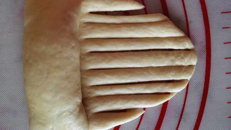 6. 取一个面团擀成牛舌状,一端放入适量果酱,
