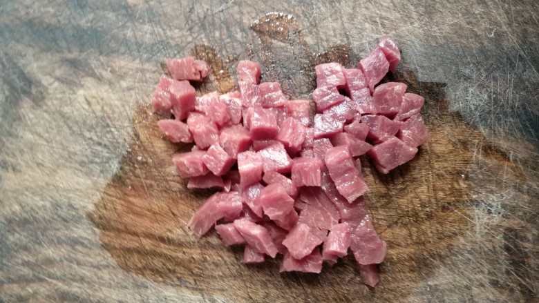 1. 将牛排提前从冰箱拿出解冻,用厨房纸巾吸干水份,切成粒