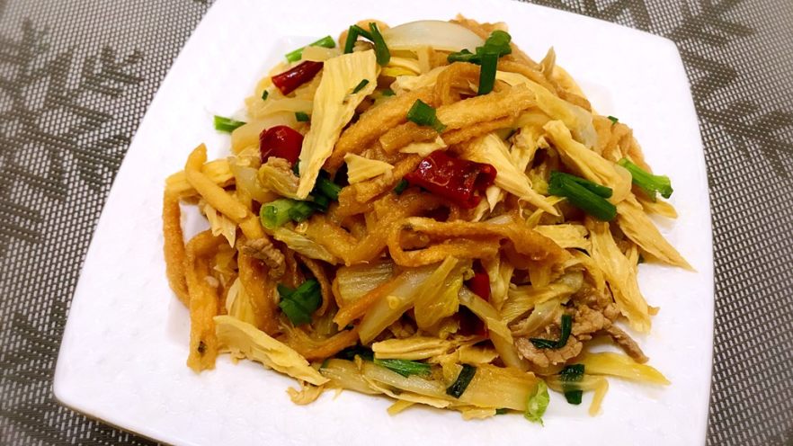 10. 白菜稍软加入腐竹翻炒,加少量一点点水