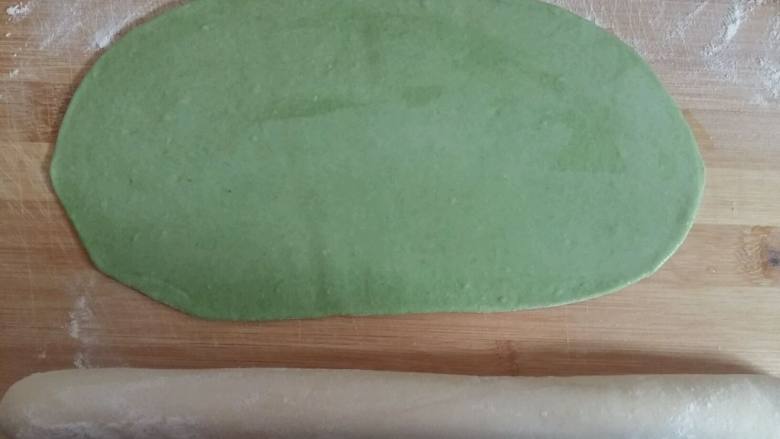 15. 绿色面团上刷少许水,然后把白色面团放进去卷起来,搓匀。