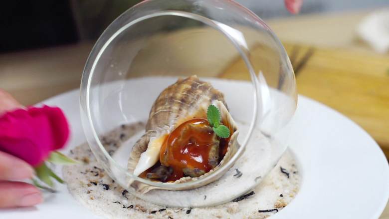 15. 焗好的海螺拿出来,把部分盐粒放入透明玻璃罩