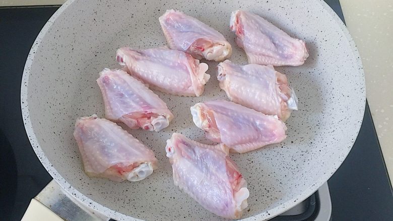 10. 平底不粘锅烧热后转小火 放入鸡翅中(因为鸡翅皮饱含油脂所以不需要刷油)
