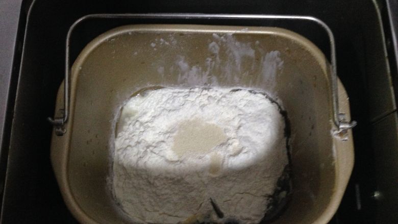 2. 上面再 加入高粉和干酵母,启动和面程序20分钟