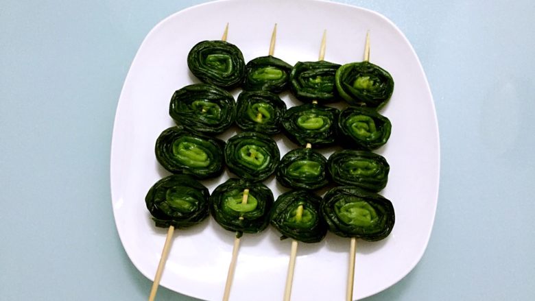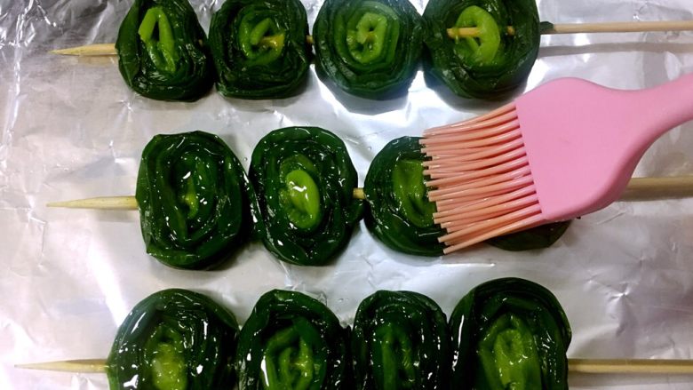 8. 烤盘铺上锡纸,把韭菜放入烤盘