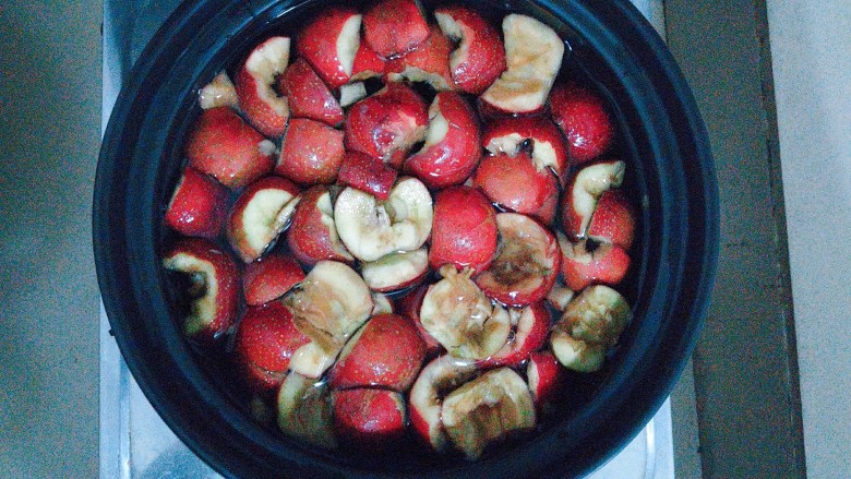 9. 放到一个砂锅里加入1000ml水开大火煮!记住山楂一定不能用铁锅或金属类的锅来煮,会产生化学反应,不仅颜色会不好看,对身体也会产生不好的影响!