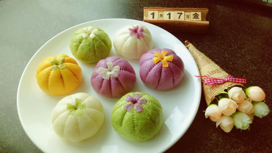 11. 做好的小花放在豆沙包的顶部,用筷子辅助压紧