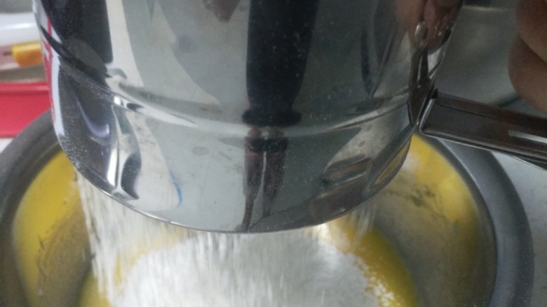 8. 将面粉和可可粉红曲粉过筛到入蛋黄中