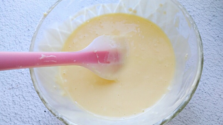4. 翻拌均匀至表面无明显颗粒,蛋黄糊制作完成备用