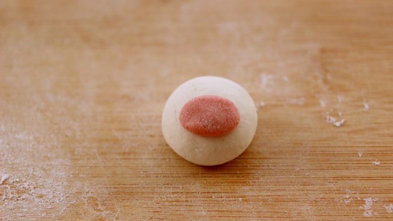 11. 把馅料包入以后、取一点粉色面团揉成长圆形、蘸点水粘在白色面团上做鼻子