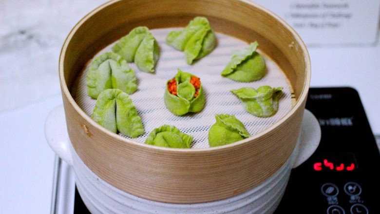 喜欢各种花样面食、今天就用菠菜汁和的面做的蒸饺、嘻嘻、真的是漂亮又健康营养哟……