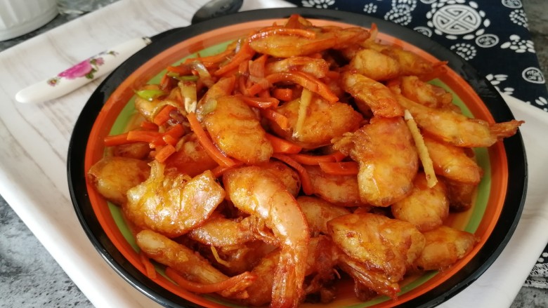 12. 加半小碗淀粉水后加入炸好的大虾翻炒出锅