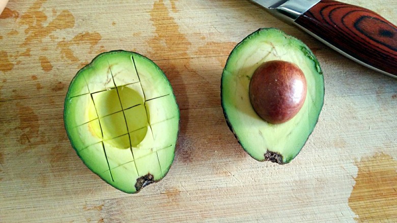 2. 牛油果从中间对切,然后切网格,果肉用勺子挖出。