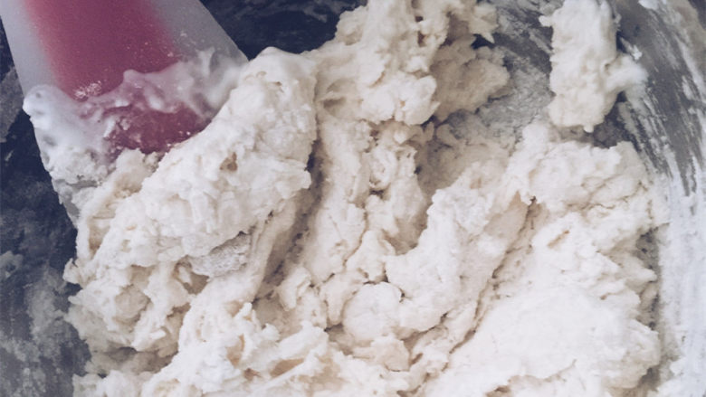 2. 不要使用搅面头,就用刮刀搅拌均匀就好。因为很黏,所以还要清理搅面头。对于“懒人”我来说程序上越简单越好,O(∩_∩)O哈哈~状态是,用刮刀触碰面团,面团会有一部分沾黏在刮刀上。如果一点都不沾粘,或者黏在刮刀上分离不下来都是不对的。