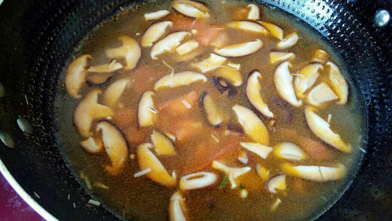 10. 西红柿块炒软,放入香菇片和金针菇段继续翻炒