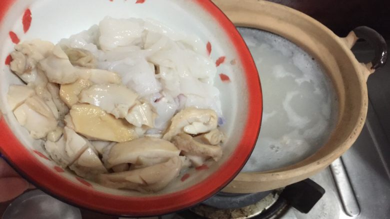 5. 煮至大米熟了一半时,把鱿鱼和鲍鱼加入。
