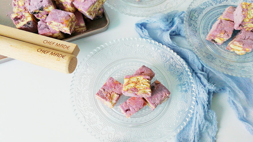 原味的雪花酥看腻了,我们就来份颜值高的雪花酥,淡紫色不错吧,这次用了小葫芦饼干,还是不错的,用了学厨牛轧糖三件套整形超级容易。