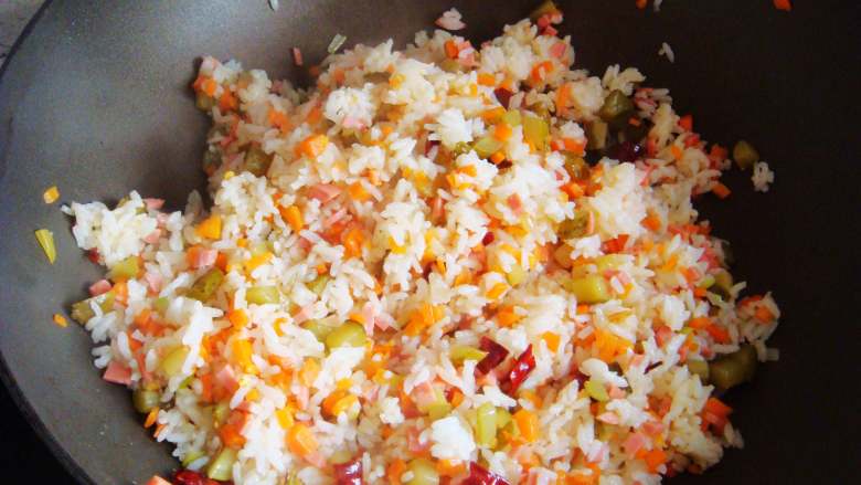 1. 最好使用不粘锅炒米饭,中小火候翻炒,蔬菜部分可替换成自己喜欢的。