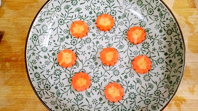5. 将两袋日本豆腐等分切成8块,摆在胡萝卜片上。