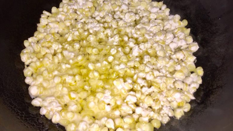 9. 再加入油,油一定要没过玉米粒,大火3分钟,再转中火3分钟,直至玉米粒酥脆。