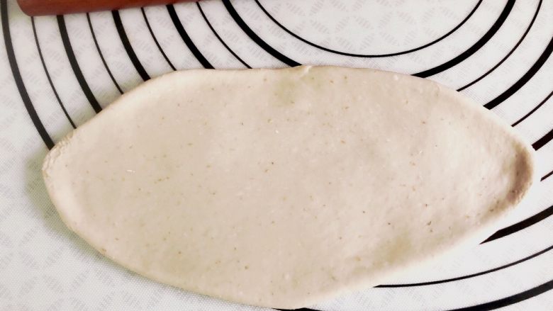 8. 原味的做好了,再来做肉松的。 取一个面团擀成椭圆形面皮。