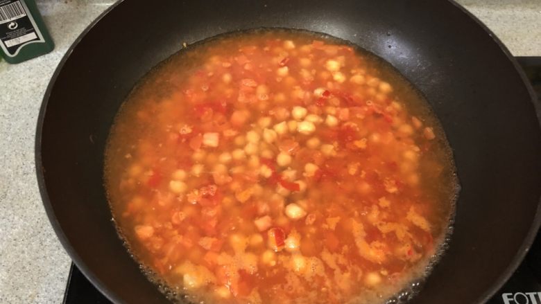 12. 把西红柿煸炒出汤汁后,倒入泡好的鹰嘴豆,继续煸炒!