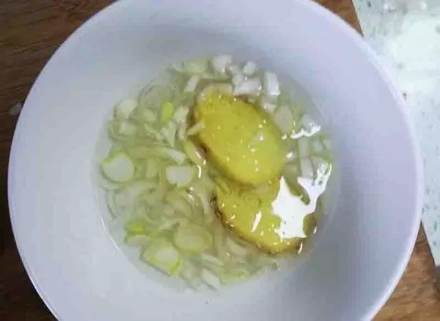 1. 葱切碎,姜切片,倒入凉白开25克浸泡。
