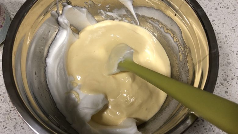 7. 蛋白霜分三次加入到蛋黄糊中、用刮刀划J字形上下翻拌均匀